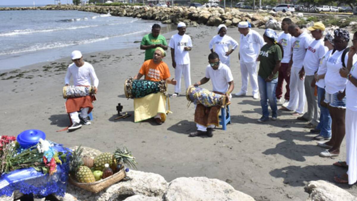 Llegaron desde las 8:30 a.m. de un domingo soleado, con atuendos blancos y sus tambores, que acomodaron en la playa, alrededor de un altar con ofrendas florales, frutas frescas y una botella de aguardiente.
