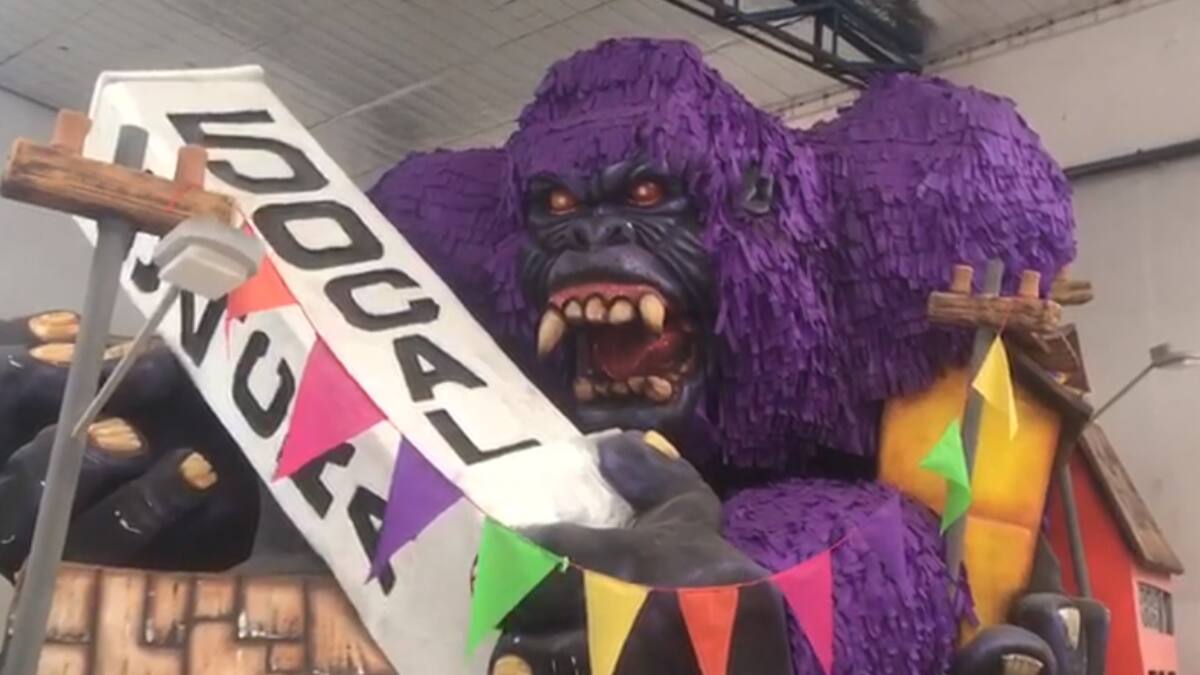 Una de las que capta la atención en medio de tantos papeles, cartones, varillas y máquinas de soldar es un enorme gorila de color púrpura que se mueve de lado a lado abriendo la boca para mostrar sus afilados colmillos. En sus manos sostiene una nomenclatura que nos ubica en pleno corazón de Barrio Abajo (Carrera 54 con calle 50). 'Esta será sin duda una de las que mayor impacto causará porque es muy dinámica. Es imponente, se llama ‘Suéltame gorila’ y recorre la esencia del merengue dominicano y su influencia en nuestro Carnaval, obviamente también engrandece a Barrio Abajo, el sector que más Carnaval respira durante el año', explicó Antonio De Alba, diseñador conceptual 3D de Carnaval de Barranquilla S.A.S.