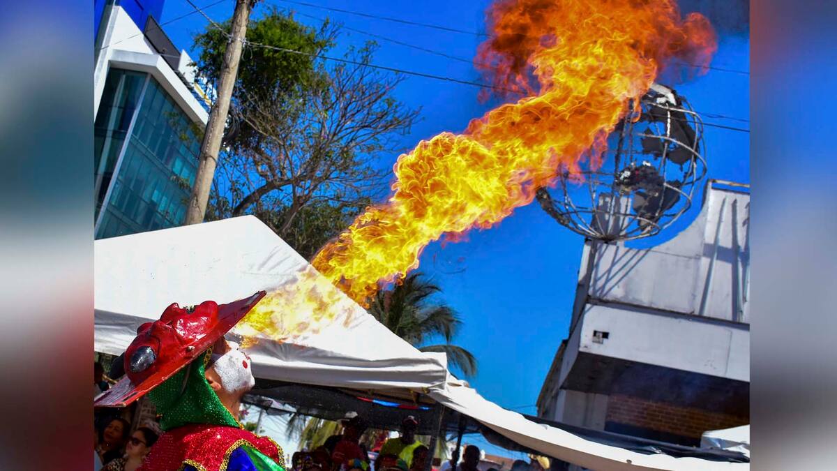 El viento cambiaba de dirección sin avisar. Uno de los integrantes dio un paso al frente para poder mostrar la fuerza de estos diablos caribeños que ‘escupen fuego’. Los tambores dejaron de repicar por un instante y, entonces, fue en ese momento cuando aquel carnavalero con alma de dragón se pudo concentrar para evitar un error. Una bola de fuego se extendió por el aire, como queriendo abrazar el cielo, chamuscando un planeta de hierro ubicado en la cima de un desocupado local de la calle 84.