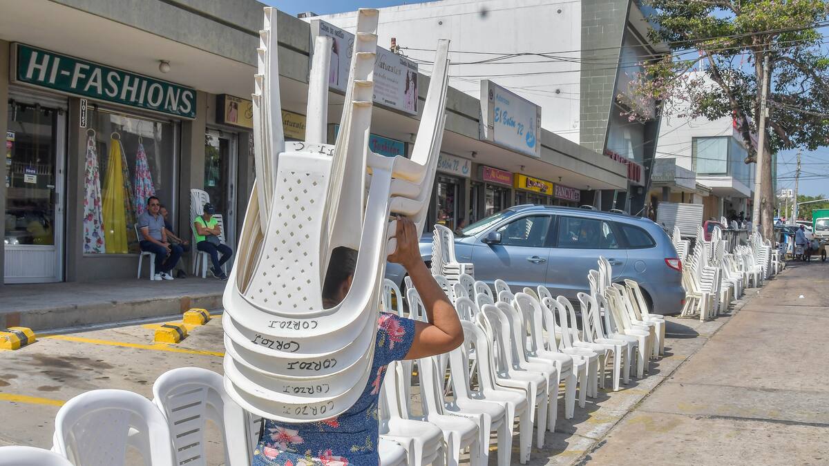 En medio del alto tráfico, grupos personas se encargan del cerramiento de varios locales comerciales, mientras que otros ciudadanos se dedican a la organización de las sillas que servirán como ‘tribuna’ para observar este desfile.