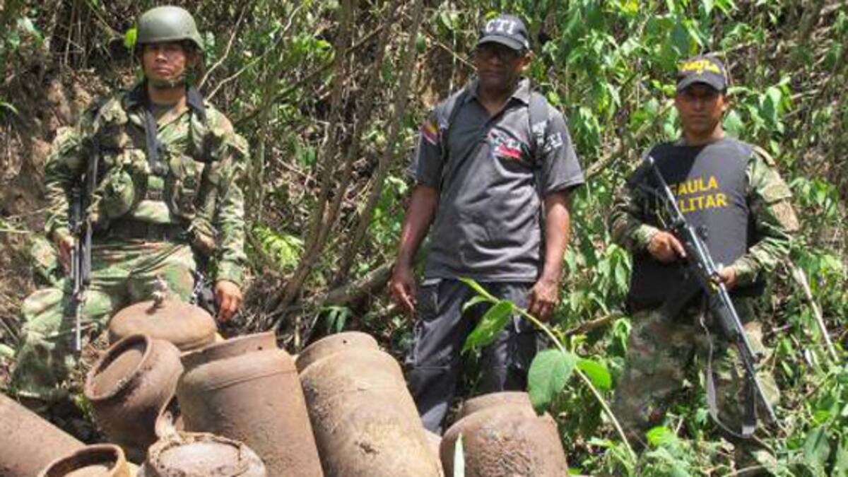 Labores de inteligencia y operativos conjuntos entre el Cuerpo Técnico de Investigación de la Fiscalía, la Fuerza Aérea y el Ejército, permitieron ubicar en zona rural del municipio de La Jagua de Ibirico, al centro del Cesar, una caleta con 59 cilindros 'bombas' pertenecientes al ELN.