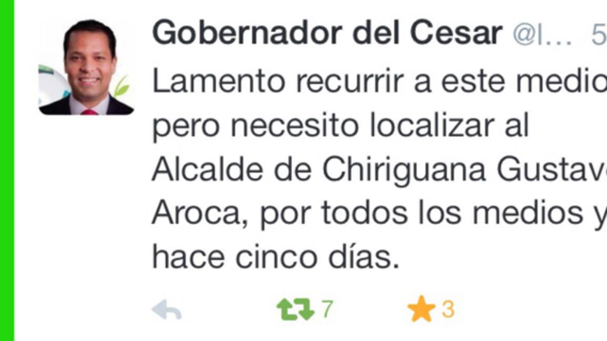'Lamento recurrir a este medio, pero necesito localizar al alcalde de Chiriguaná Gustavo Aroca, por todos los medios y hace cinco días', escribió el gobernador Monsalvo en su cuenta de Twitter.
