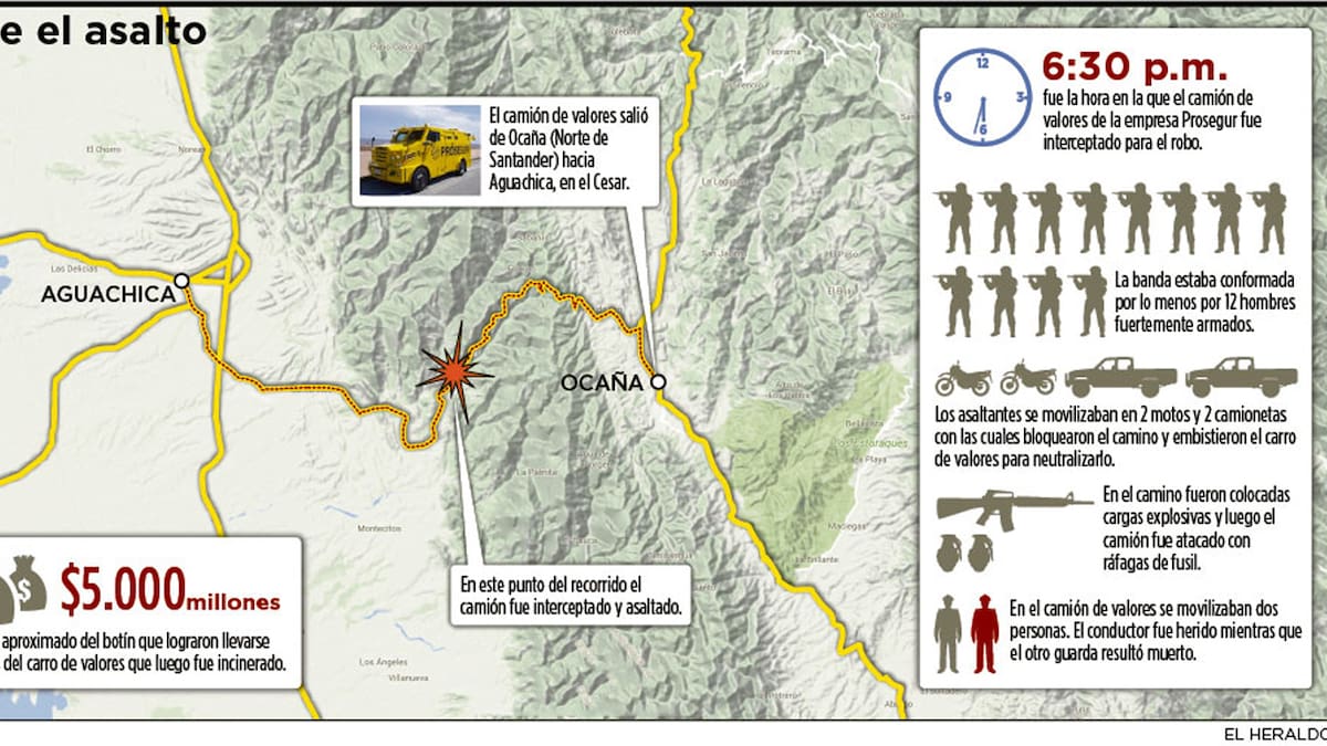 El coronel Luis Pérez, comandante operativo de la Policía en el Cesar, señaló que los delincuentes interceptaron el vehículo de valores, atravesando una de las camionetas en la vía, mientras que la otra chocó al camión para neutralizarlo, a fin de cometer el hurto.