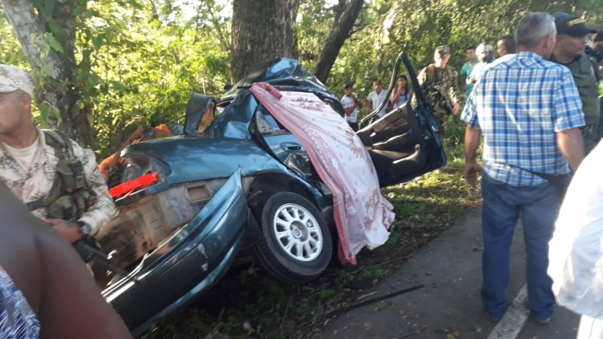 'Es un vehículo tipo sedán, en el que viajaban cinco personas, el cual se sale intempestivamente y choca con un árbol, ocasionando la muerte de cuatro de los ocupantes y heridas a una mujer', puntualizó el oficial.