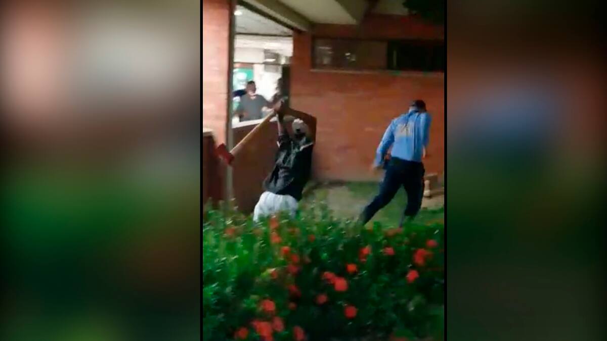 El hecho registrado la noche de este jueves quedó grabado en video el cual muestra como el paciente, al parecer, un joven de 16 años, con el hacha en sus manos perseguía por uno de los jardines del centro asistencial al celador que trató de persuadirlo para quitarle esta herramienta.