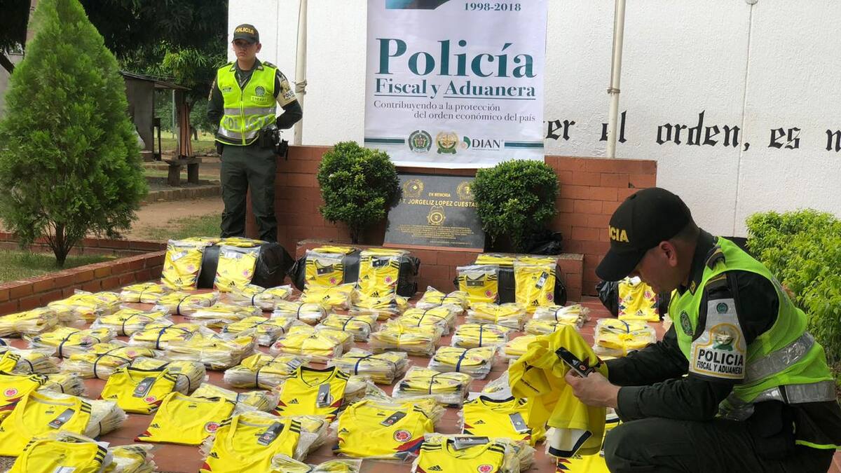 En un puesto de control en la entrada de Valledupar, la Policía Fiscal y Aduanera incautó 1.585 camisetas de la Selección Colombia, de contrabando, que pretendían ser comercializadas en esta capital en el marco de la Copa América que se juega en Brasil.