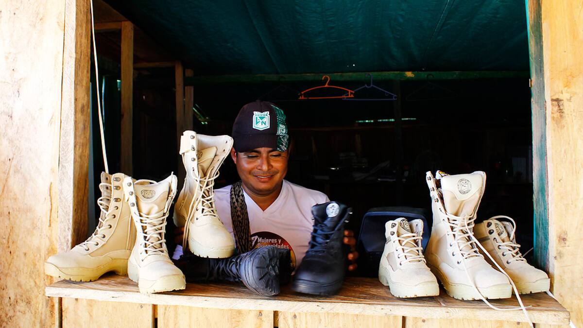 Señala que 'este calzado es muy apetecido, aquí hasta los militares llegan a comprarlas, viene gente de todas partes a comprarlas, es un calzado de calidad, hecho por compañeros en medio de este proceso de reincorporación'.