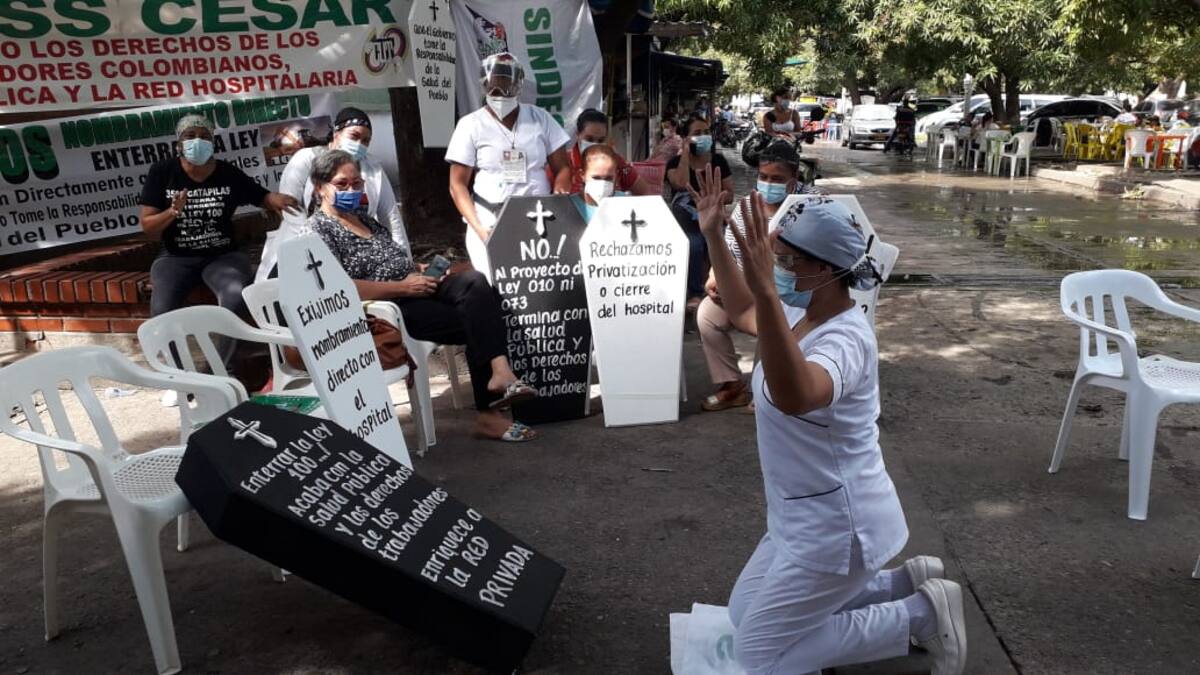 Ana Rodríguez, integrante de la junta directiva del Sindicato de la Salud en el Cesar, indicó que 'estamos en cese de actividades, y en un platón nacional por la defensa de la salud pública; le decimos no a la privatización, ni a la tercerización de los trabajadores; aquí le decimos al Gobierno que mire a estos empleados que llevan 12 meses sin sueldos, y lo que recibimos es represión, recorte de personal'.
