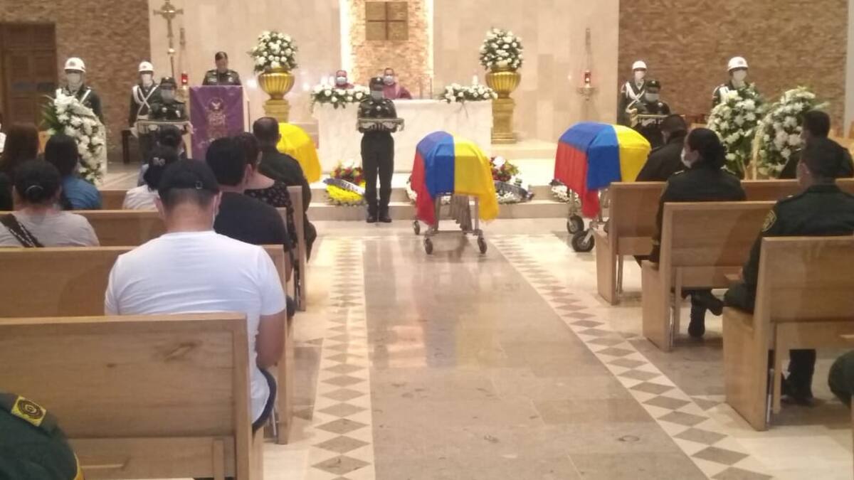Los ataúdes forrados con la bandera de Colombia permanecieron en el templo, mientras se les rendía un homenaje a los tres patrulleros que murieron víctimas de un ataque a bala perpetrado por dos sujetos en moto cuando departían con familiares y amigos en un centro recreacional de Pailitas, mientras disfrutaban de un descanso.
