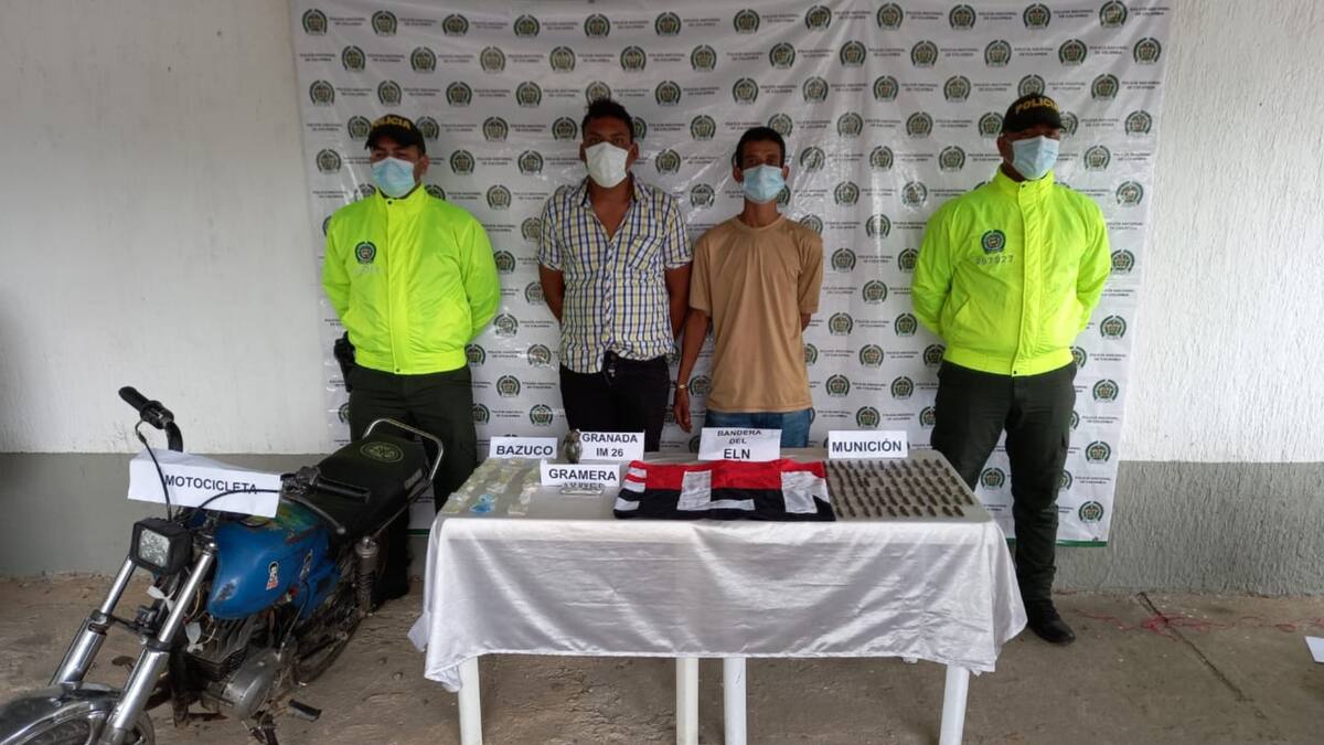 Los efectivos de la Policía le incautaron a estos sujetos una bandera alusiva al Eln, una granada IM-26, una gramera digital, 70 cartuchos calibre 7.62 para fusil, 50 dosis de bazuco y una motocicleta.