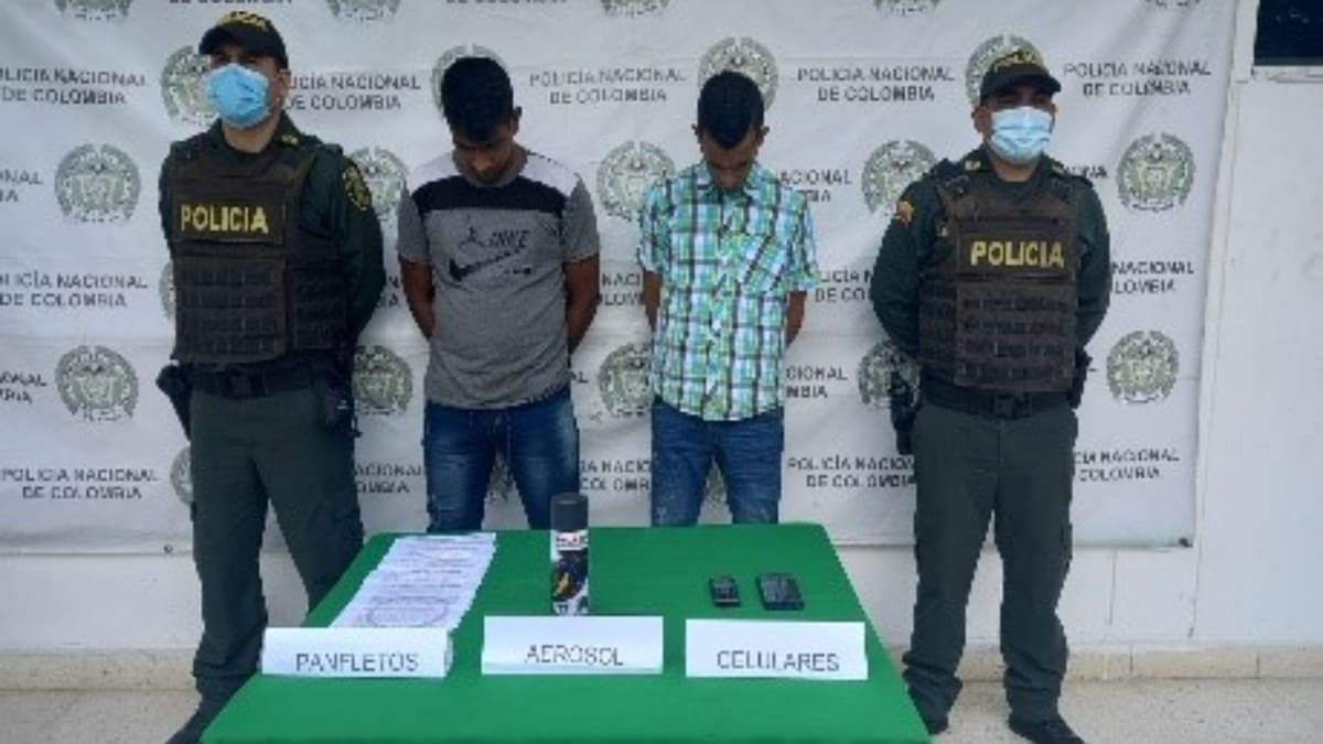 'A estas personas se le incautaron cinco panfletos alusivos a ese grupo delincuencial, una lata de pintura tipo aerosol de color negro con los que se realizaron los grafitis, dos teléfonos celulares; de inmediato se le materializan los derechos que tienen como detenidos y fueron dejados a disposición del fiscal en turno en la unidad de reacción inmediata de Aguachica por el delito de terrorismo', informó la Policía.