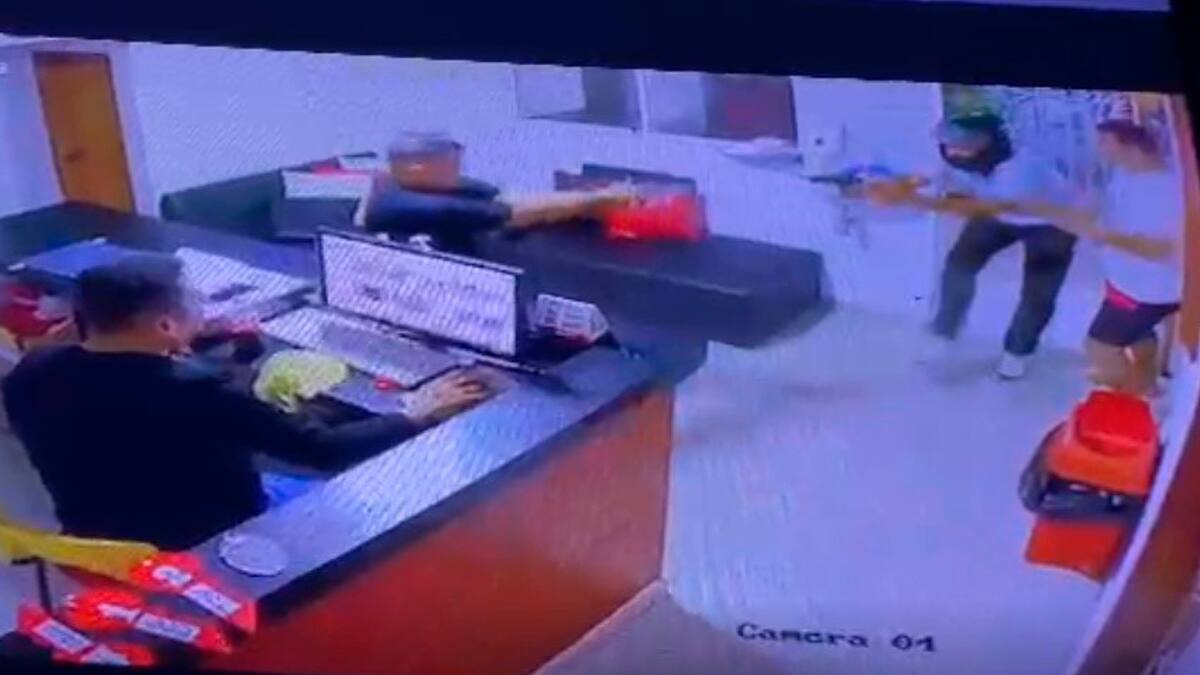 El hecho quedó grabado en las cámaras de seguridad del establecimiento, donde se observa ingresar al presunto atracador cubriéndose la cabeza con un casco de motociclista, detrás de dos hombres a los cuales aborda para despojarlos de sus pertenencias, siendo ellos agentes policiales, uno de los cuales desenfunda su arma y se enfrenta a tiros con el sujeto que logra salir del lugar y desplomarse gravemente herido unos metros más adelante.