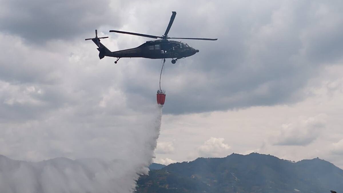 'Es un helicóptero 12 que está a cargo de la Fuerza Aérea Cacom 3. Hemos realizado 13 inyecciones de agua, manejando un aproximado de 2.226 litros de cantidades de agua, 13 litros de retardante y hemos volado cerca de 2 horas con tres descargas', precisó el alto oficial.