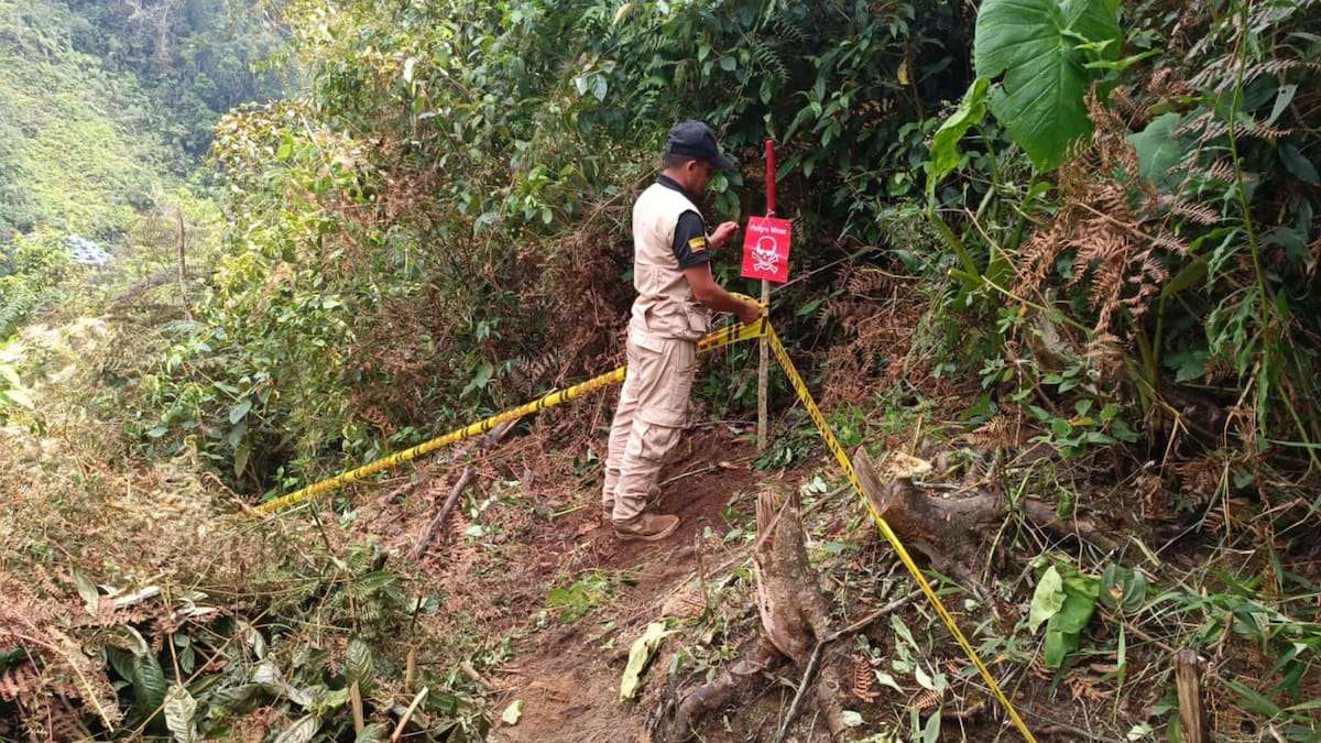 'En este trabajo hicimos investigación con equipos no técnicos, abordamos 55 sectores, 24 veredas, entramos a los sitios donde aportaban algún tipo de información, eventos que estaban reportados en la nuestra base de datos y en la Oficina del Alto Comisionado para la Paz. También hicimos educación en el riesgo de minas logrando la capacitación de más de 600 personas a fin de que entendieran los comportamientos seguros que hay que tener', expresó el coronel Carlos Tarazona.