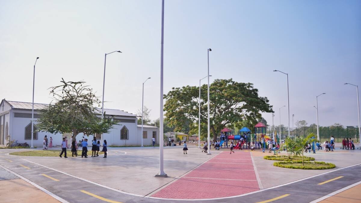 Los niños de la Institución Educativa Simón Bolívar son los principales beneficiados con esta obra que además cuenta con ciclo ruta, un parque infantil tipo elefante, pisos en cauchos para la protección de los más pequeños, gimnasio biosaludable de siete máquinas, rampas de acceso para personas con movilidad reducida. La tarima tiene cubierta e iluminación interna, amplias zonas verdes y luminarias LED, redes eléctricas y centro de transformación independiente. También mobiliarios como canecas de acero inoxidable para la correcta disposición de residuos.