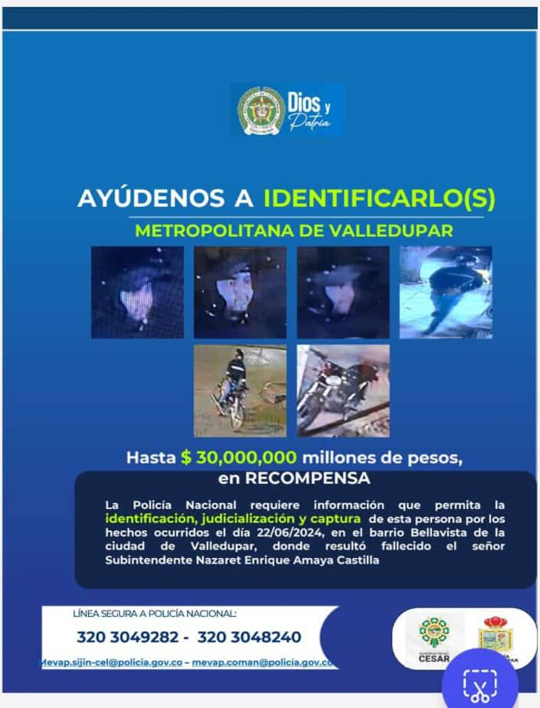 Hasta $30 millones ofrecen las autoridades de Policía y administrativas en Valledupar, por información que permita dar con el paradero de los delincuentes que acabaron con la vida del subintendente de la Policía Nacional, Nazareth Enrique Amaya Castilla, de 38 años, en hechos registrados el fin de semana en el barrio Bella Vista.