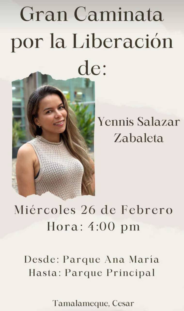 En el municipio de Tamalameque, Cesar, se realizará una marcha por la liberación de la expersonera Yennis Salazar Zabaleta, quien fue secuestrada el pasado viernes 21 de febrero y aún se desconoce su paradero.