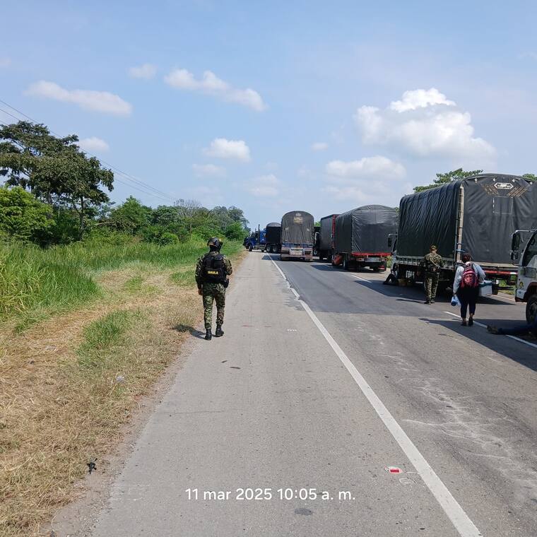 En el punto de la protesta hay presencia de la Policía Nacional y Ejército Nacional, a fin de brindar condiciones de seguridad, para los cientos de vehículos represados.
