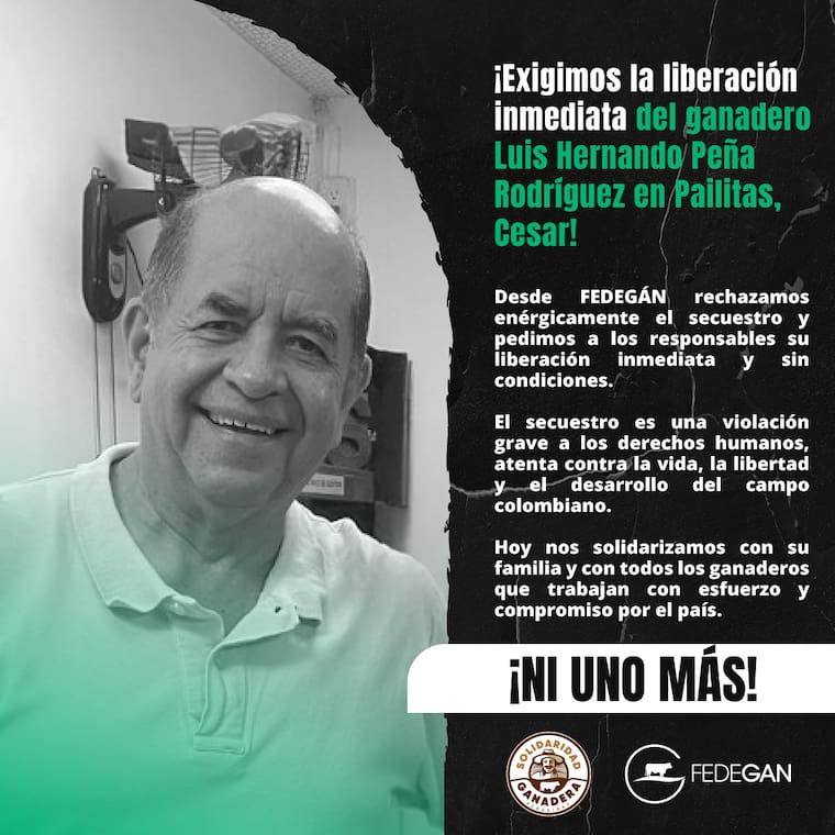 El presidente de Federación Nacional de Ganaderos, José Félix Lafaurie, denunció el secuestro del ganadero Luis Hernando Peña Rodríguez, en el municipio de Pailitas, Cesar.