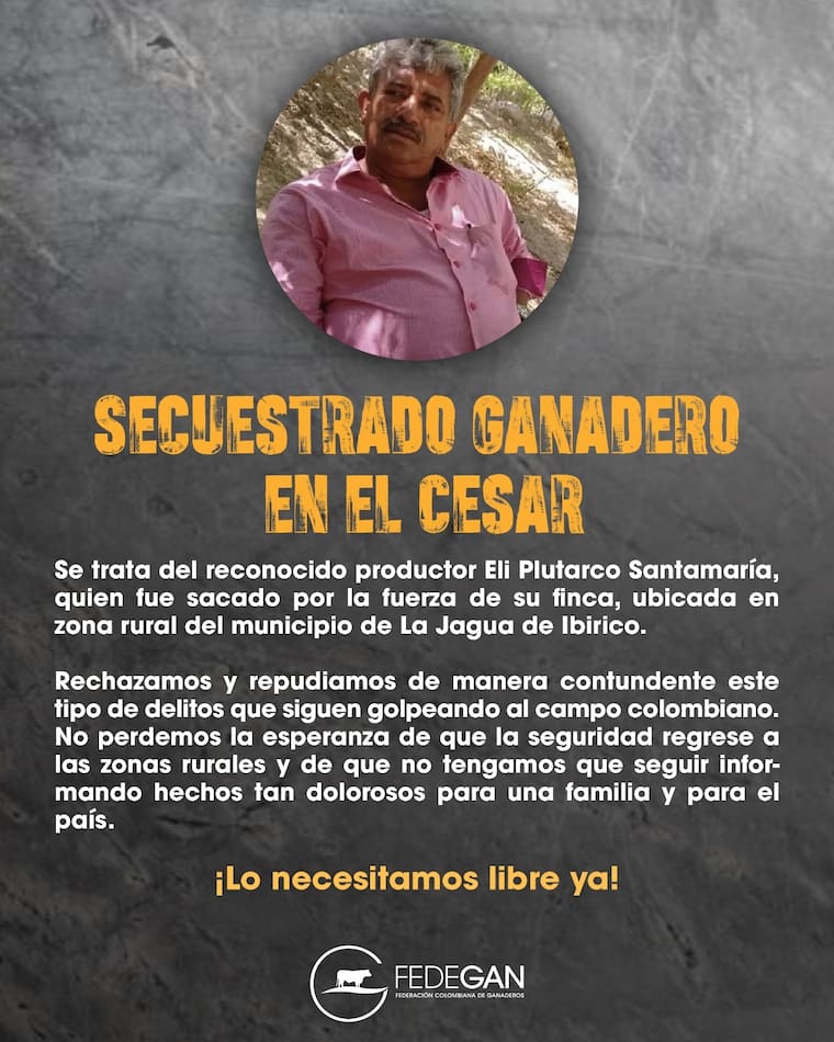 “Se trata del reconocido productor Eli Plutarco Santamaría, quien fue sacado por la fuerza de su finca ubicada en zona rural del municipio de la Jagua de Ibirico. Rechazamos y repudiamos de manera contundente este tipo de delitos que siguen golpeando al campo colombiano. No perdemos la esperanza de que la seguridad regrese a las zonas rurales y de que no tengamos que seguir informando hechos tan dolorosos para una familia y para el país”, destacó Fedagán, en un comunicado difundido por sus redes sociales.
