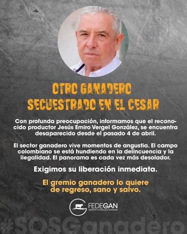 Desde el sábado 4 de abril, permanece desaparecido el ganadero Jesús Emiro Vergel González, lo cual es considerado para sus familiares como un secuestro; misma posición que mantiene Fedegán, que recientemente se pronunció y rechazó el acto.