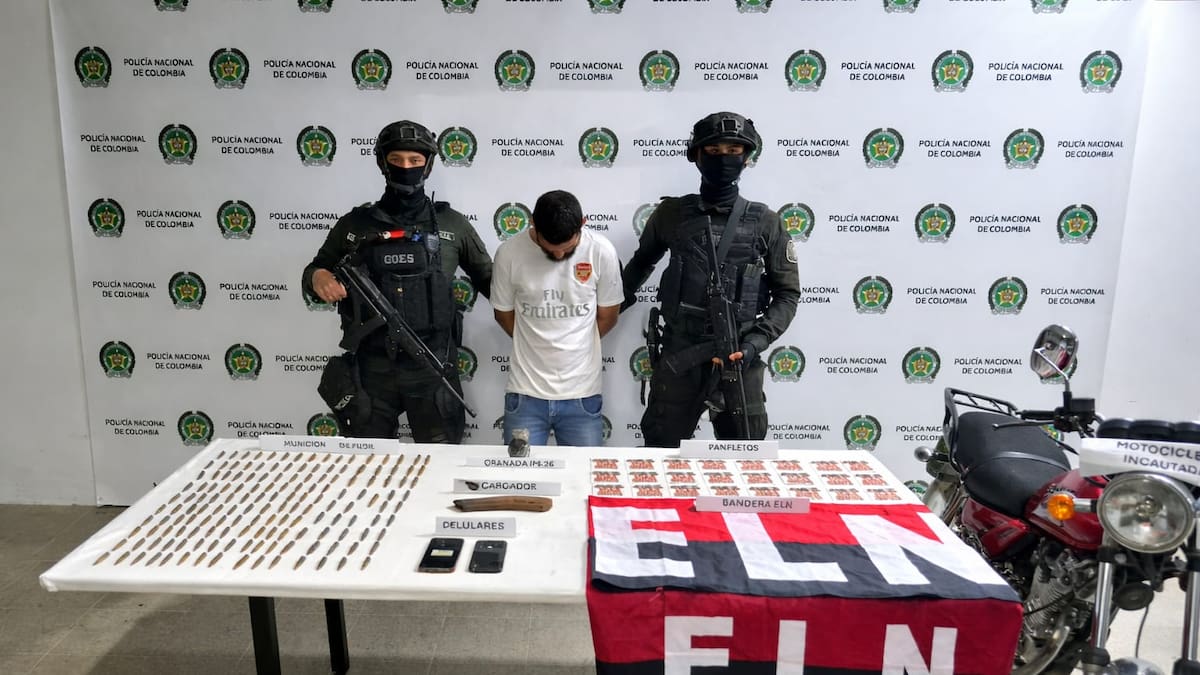 Durante el operativo se incautaron una bandera alusiva al ELN, una granada de fragmentación, municiones para fusil y una motocicleta en la que, según las autoridades, el señalado se movilizaba en zona rural.