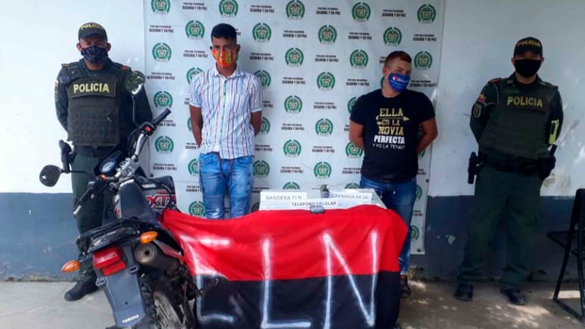 A los detenidos, identificados como Héctor Tomas Roballo, de 24 años, y Luis Albenis Jaimes, de 19, les fueron halladas en su poder una granada de fragmentación y una bandera del ELN.