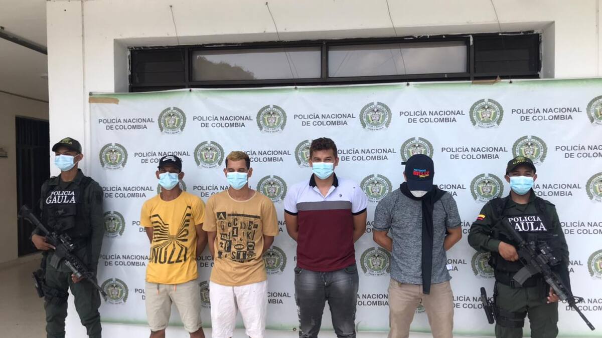 En un operativo que desplegaron las unidades del Gaula en los municipios de Pelaya y Aguachica, sur del Cesar; y Pie de Cuesta, Santander, fueron detenidos Kevin Mendoza La Torre, de 26 años; Jader Carvajalino Crespo, de 20, conocido como ‘Chepe’; Geiber Carvajalino Crespo, de 28 años, alias ´’Naker’, y Ulfran David Uribe Puentes, de 21 años, alias ‘El Coco’, quienes fueron dejados a disposición de la Fiscalía, por el delito de extorsión agravada, concierto para delinquir agravado y hurto calificado.