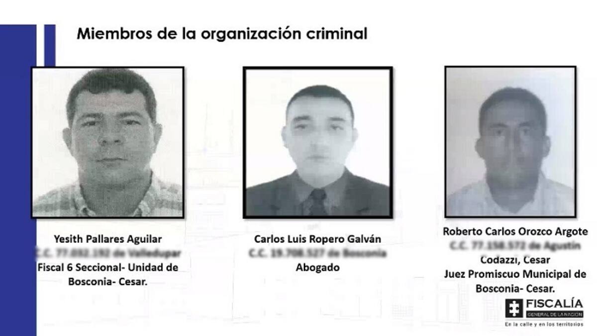 Con medida de aseguramiento en centro carcelario fueron cobijados el juez promiscuo de Bosconia, Roberto Carlos Orozco Argote; el fiscal sexto seccional en esa localidad, Yesid Pallares Aguilar; y el abogado Carlos Ropero Galván, señalados de conformar una red de corrupción con trámites de procesos judiciales en ese municipio del Cesar.
