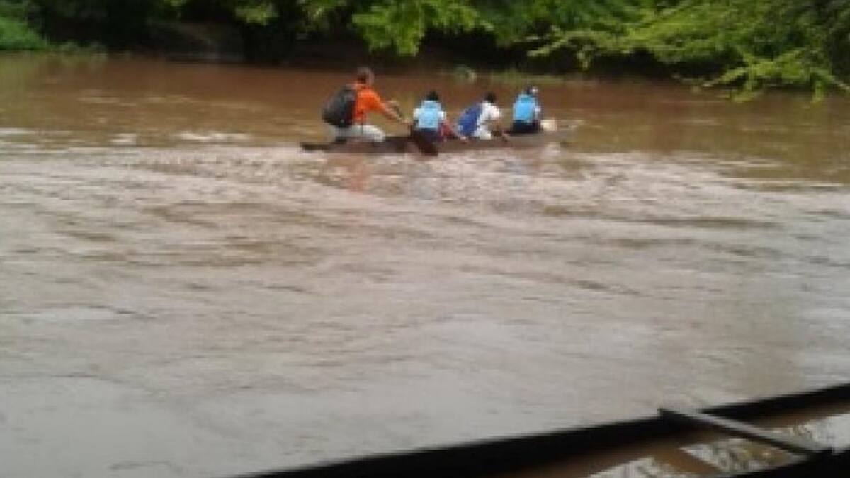 Son tres minutos que en realidad parecen más, sobretodo en esta temporada de lluvias torrenciales cuando el caudal aumenta casi al mismo ritmo que los latidos del corazón de los seis navegantes cada vez que atraviesan en la pequeña canoa.