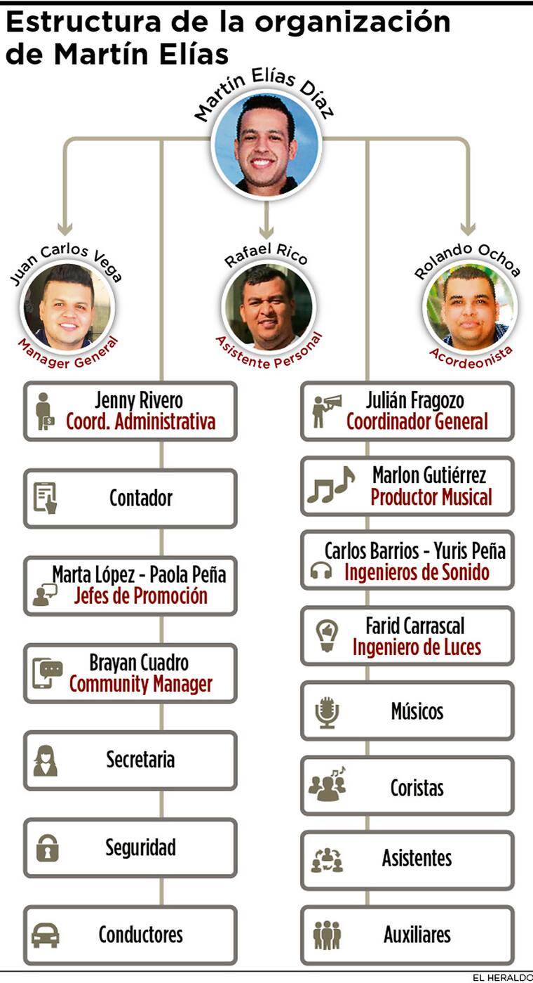 Vega dio a conocer a EL HERALDO el organigrama de la organización. 'Los artistas, Martín Elías y Rolando Ochoa, estaban a la cabeza; luego venía yo como mánager general, y de ahí se desprendían dos líneas, una administrativa y la otra musical', sostuvo.