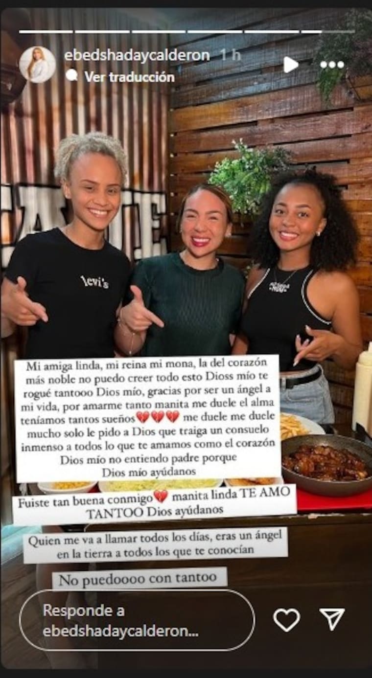 “Mi amiga linda, mi reina mi mona, la del corazón más noble, no puedo creer todo esto Dios mío te rogué tantooo Dios mío, gracias por ser un ángel a mi vida, por amarme tanto manita, me duele el alma teníamos tantos sueños”, escribió Ebed Calderón en sus historias de Instagram.