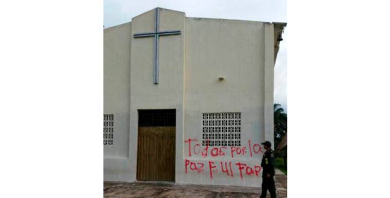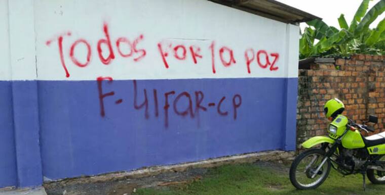 Con tinta roja escribieron 'Todo por la paz F-41 Farc' lo que no se sabe es si realmente obedece a militantes del grupo que busca una negociación con el Gobierno Nacional en una mesa de diálogo en La Habana, o de algún otro grupo al margen de la ley con la intensión de generar temor y zozobra.