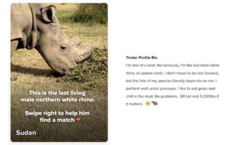 'Soy único. Soy el último rinoceronte blanco macho en el planeta Tierra. No quiero parecer un aprovechado, pero el destino de mi especie depende, literalmente, de mí. Actúo bien bajo presión. Mido 1,82 metros y peso 2.267 kilos, por si esto importa', describe en su perfil.