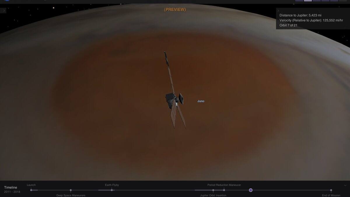 La nave espacial partió de Cabo Cañaveral (Florida, sureste) en agosto de 2011, en una misión para estudiar los orígenes, estructura, atmósfera y magnetósfera de Júpiter.