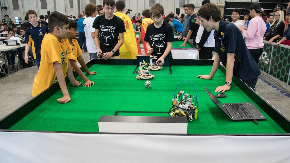 En una mesa, un grupo de adolescentes australianos afinaron sus aparatos para tratar de ganar la posesión de una pelota de 'fútbol' transparente del tamaño de la palma de una mano que contenía un sensor. Los robots pudieron detectar la pelota, agarrarla mientras se defendían de sus rivales y proteger el área chica.
