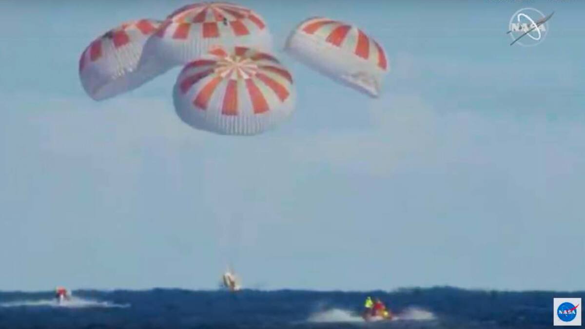 Las imágenes en directo de la agencia espacial norteamericana mostraron la apertura de los paracaídas y el amerizaje a las 08H45 (13H45 GMT), la hora prevista, a unos 370 km de las costas de Florida (sureste).