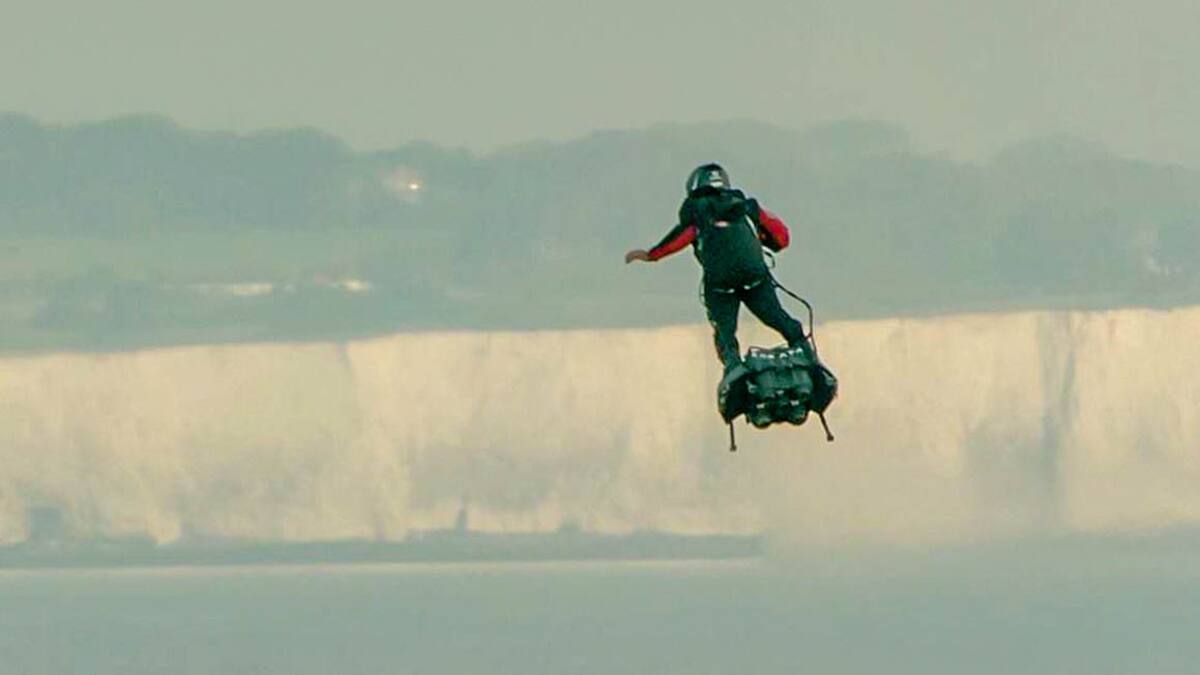 Luego volvió a despegar hacia las costas británicas, donde aterrizó tras haber recorrido los 35 km del estrecho, de pie sobre su máquina voladora dotada de cinco turborreactores de aire que permiten despegar y avanzar a hasta 190 km/h, con una autonomía de unos diez minutos.