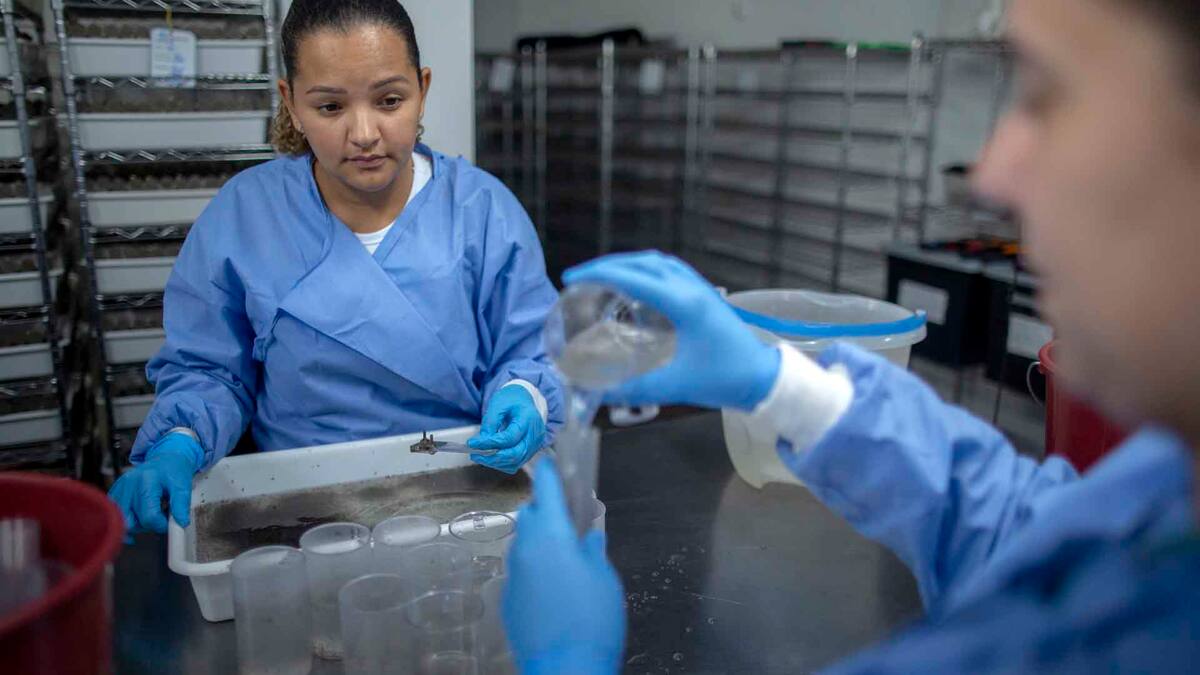 Los huevos, que heredan Wolbachia de las hembras, son cosechados y transferidos a grandes tubos de ensayo.