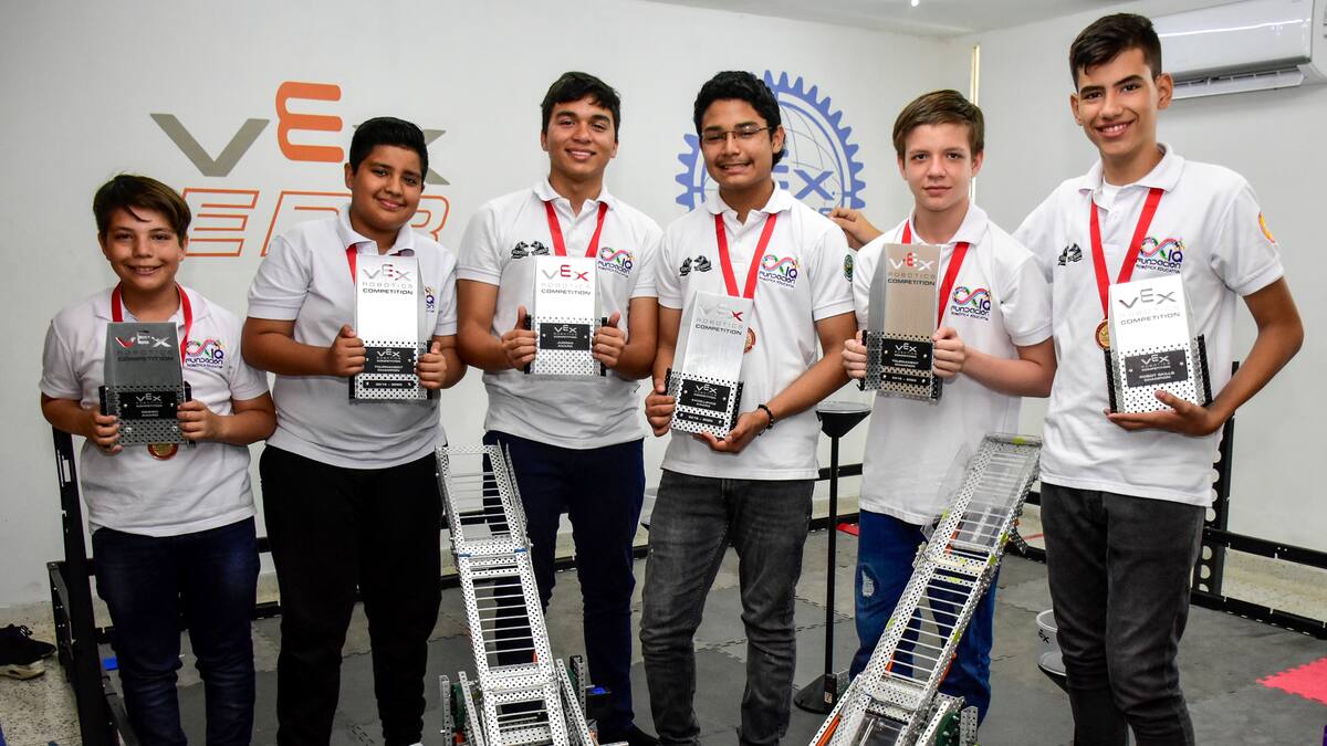 Ellos son Adrián Martínez, Juan Camilo Avendaño, Leandro Ortiz, Miguel Ángel Soto, Eden Kassemek y Ethan Rojas, quienes ganaron seis de los siete premios que estaban en competencia en el II Torneo Internacional de VEX en Sudamérica, que se realizó en Medellín en el coliseo de la Universidad Pontificia Bolivariana, del 26 al 28 de febrero.
