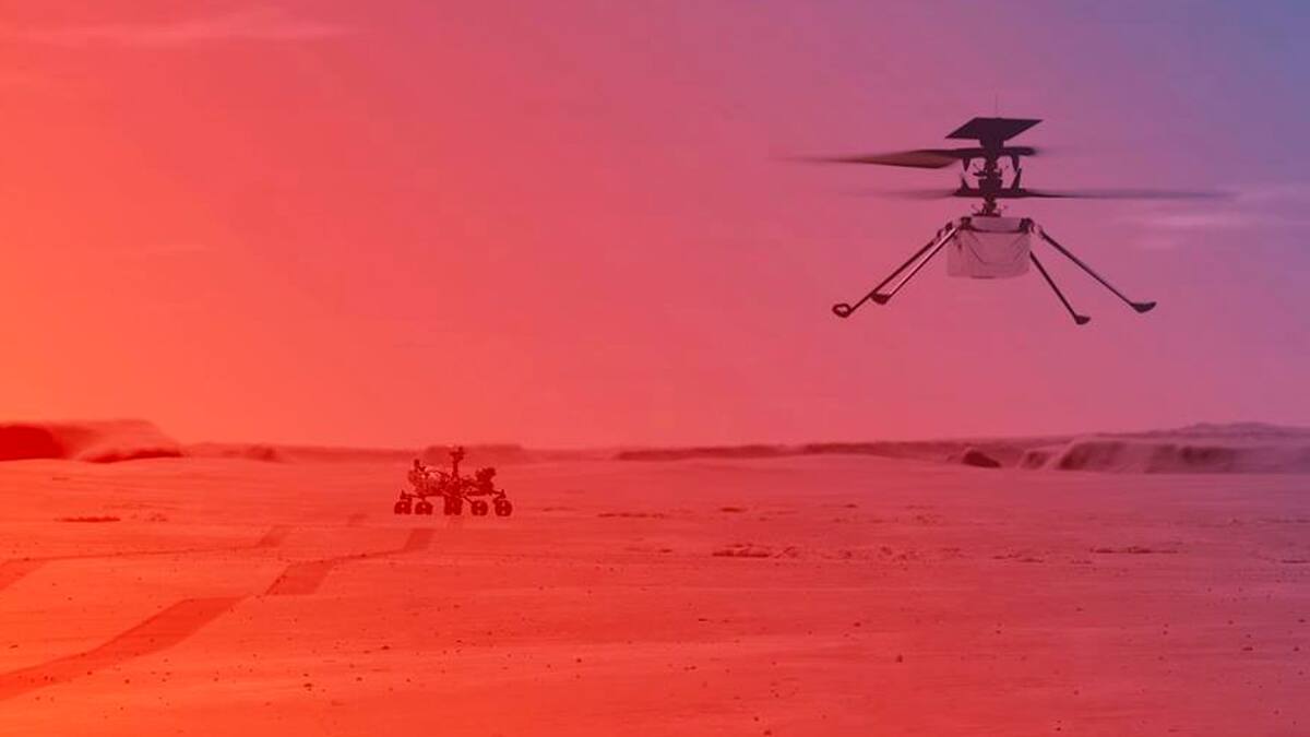 Imagen de la Nasa muestra cómo sería un vuelo del helicóptero Ingenuity en Marte. El aparato se alzará por primera vez no antes del 11 de abril.