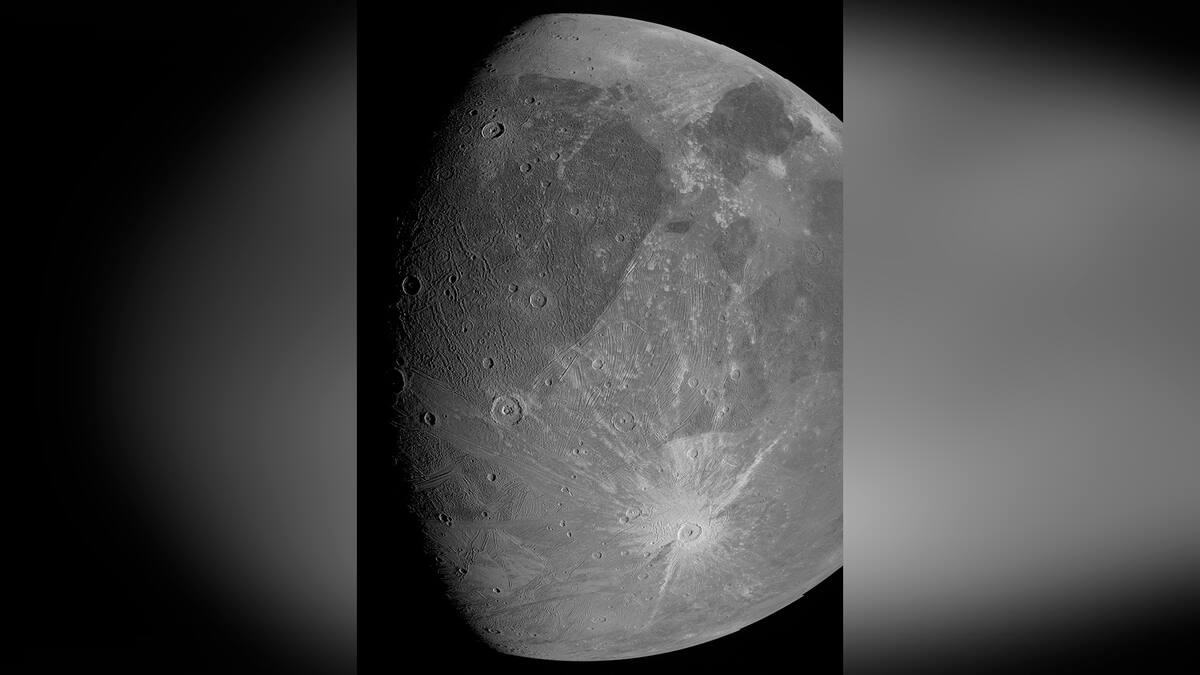 La agencia espacial estadounidense NASA divulgó este martes las dos primeras imágenes del sobrevuelo de la nave espacial Juno a Ganímedes, la luna gigante de Júpiter, con detalles de cráteres y terrenos claros y oscuros.