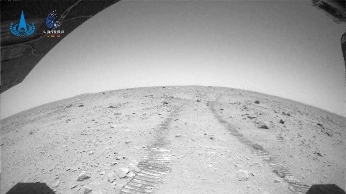 Se trata de dos fotografías, tres videos y un audio. Entre las imágenes hay una panorámica de 360 grados de la superficie pedregosa, y una instantánea de la rodada del ‘Zhurong’ (llamado así en honor al dios del fuego de la antigua mitología china) con el módulo de amartizaje de la sonda Tianwen-1 al fondo.