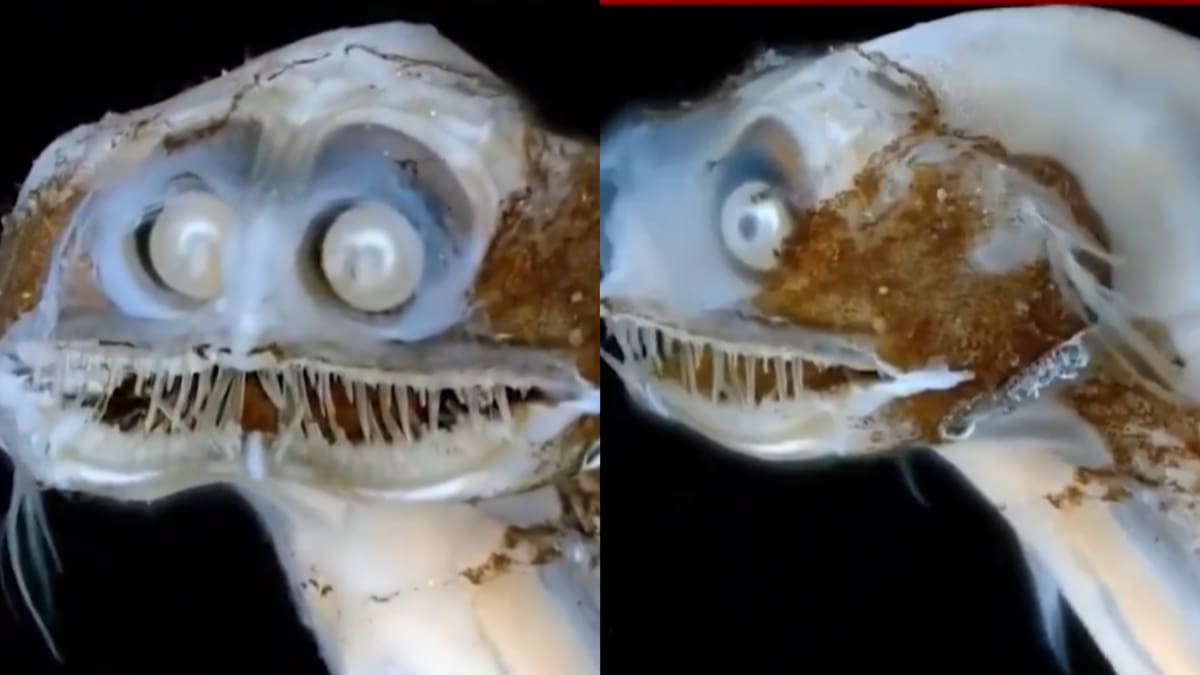 El video muestra a un animal translúcido, con ojos tubulares orientados hacia adelante, mandíbulas desproporcionadas y una boca llena de dientes afilados. A simple vista, parece sacado de una película, pero es real.