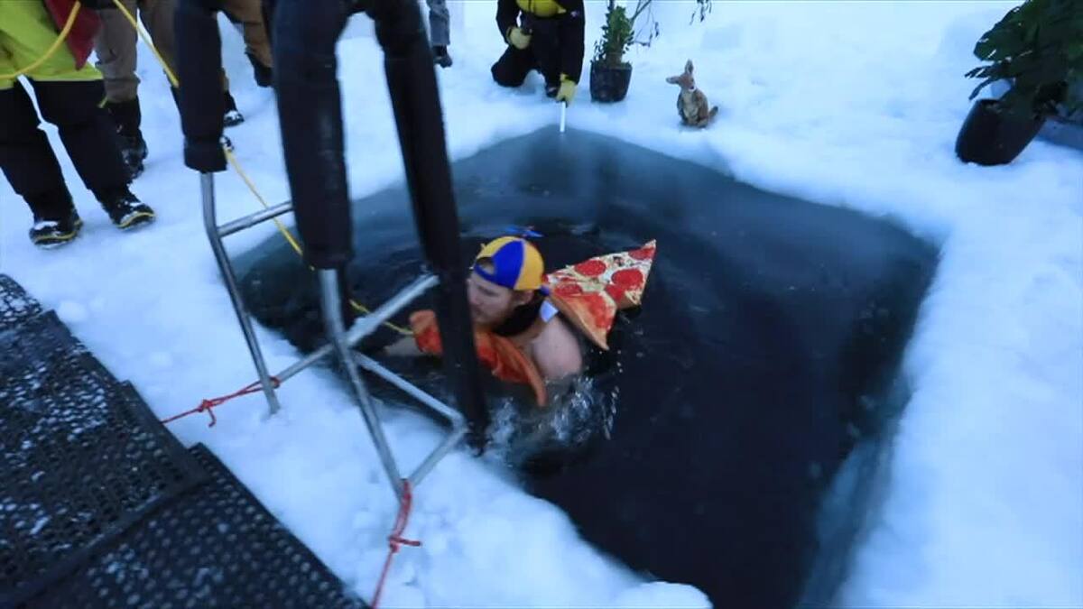 Científicos en la Antártica celebraron el solsticio de invierno del hemisferio Sur con un chapuzón en aguas heladas.