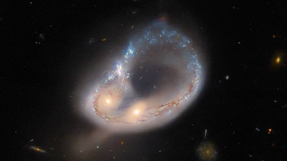 El telescopio espacial Hubble captó el momento en que las galaxias entrelazadas, conocidas como Arp-Madore 417-391, chocaron entre sí dejando un gigante anillo de estrellas a su paso.