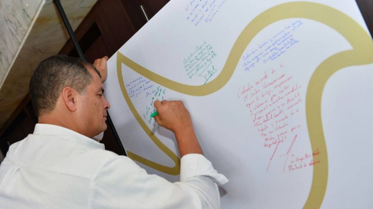 A su llegada al Centro de Convenciones Julio César Turbay de Cartagena, los jefes de Estado y de Gobierno que participan en la XXV Cumbre Iberoamericana, firmaron un cartel dispuesto a la entrada del salón de reuniones con la imagen de la paloma de la paz.