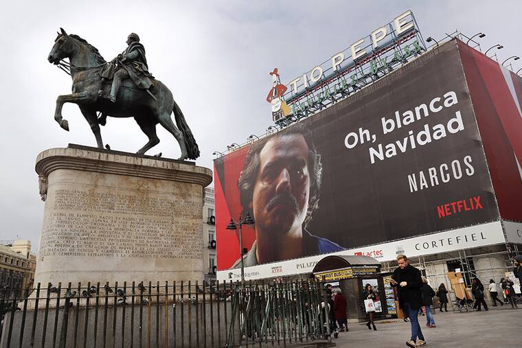 La valla puesta en la Puerta del Sol, corazón de la capital española, muestra al actor Wagner Moura, protagonista de la serie, junto al lema 'Oh, blanca navidad'.