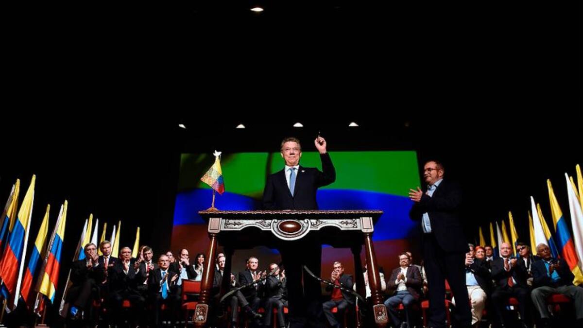 El presidente colombiano, Juan Manuel Santos, y el máximo jefe de las Farc, Rodrigo Londoño, alias Timochenko, firmaron el pasado 24 de noviembre en el Teatro Colón de Bogotá el acuerdo de paz.