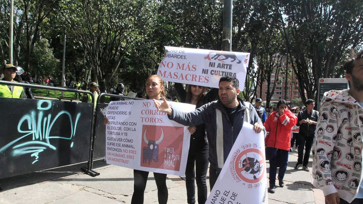 Grupos de antitaurinos se enfrentaron este domingo a la Policía en los alrededores de la plaza de toros La Santamaría de Bogotá, donde se dieron cita para protestar por la polémica reapertura del coso después de permanecer cuatro años cerrado.